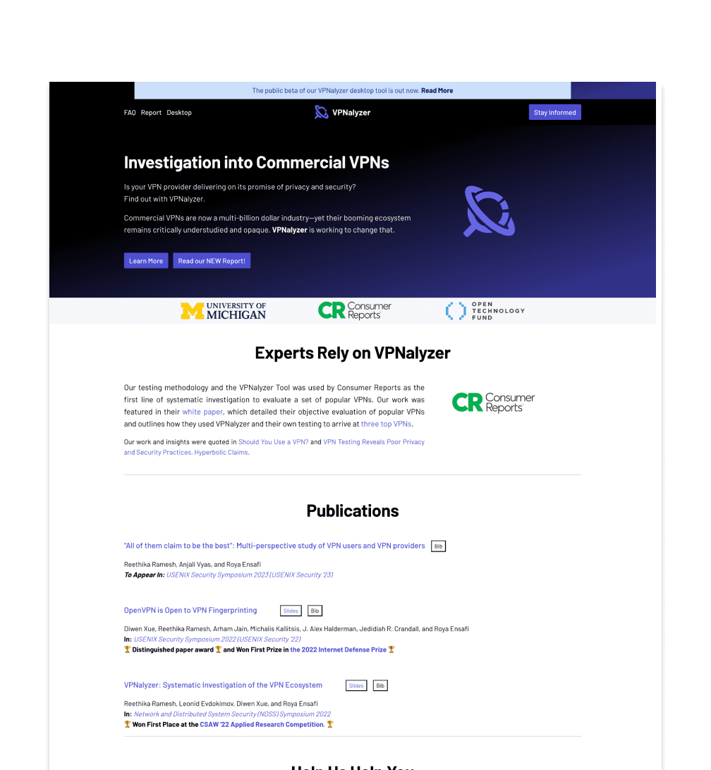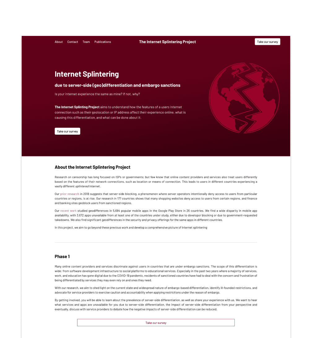 The original site was built around the Censored Planet Observatory, the lab’s flagship censorship measurement platform. Over time the lab launched additional initiatives, including VPNAnalyzer and the Internet Splintering Project, each with its own site.