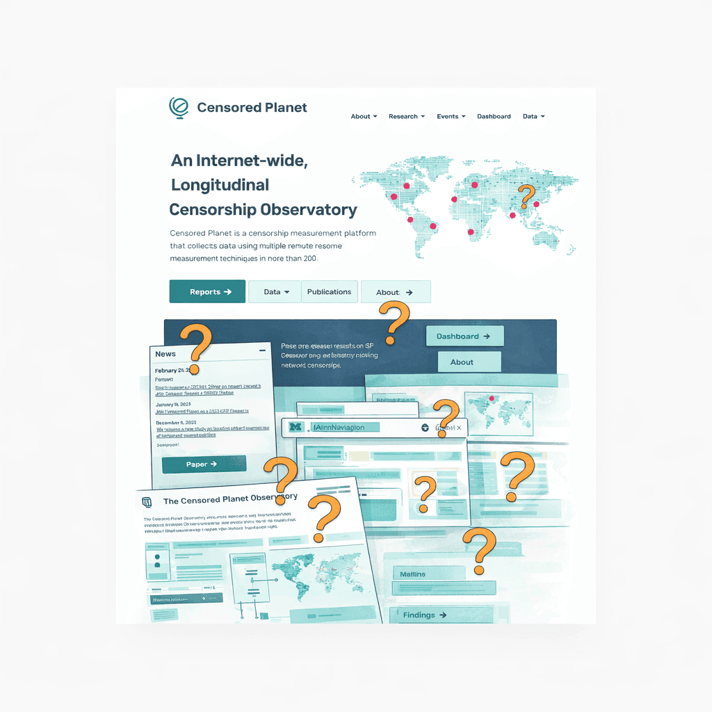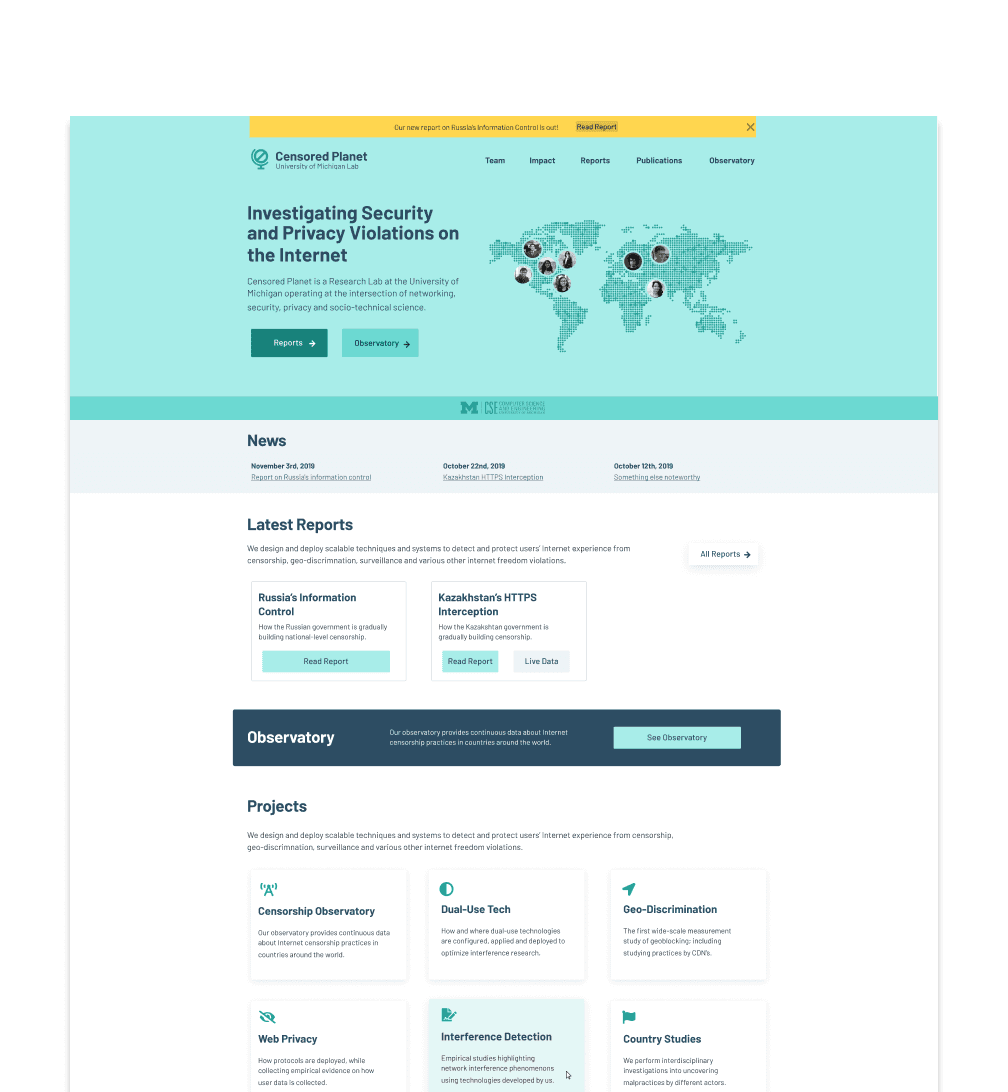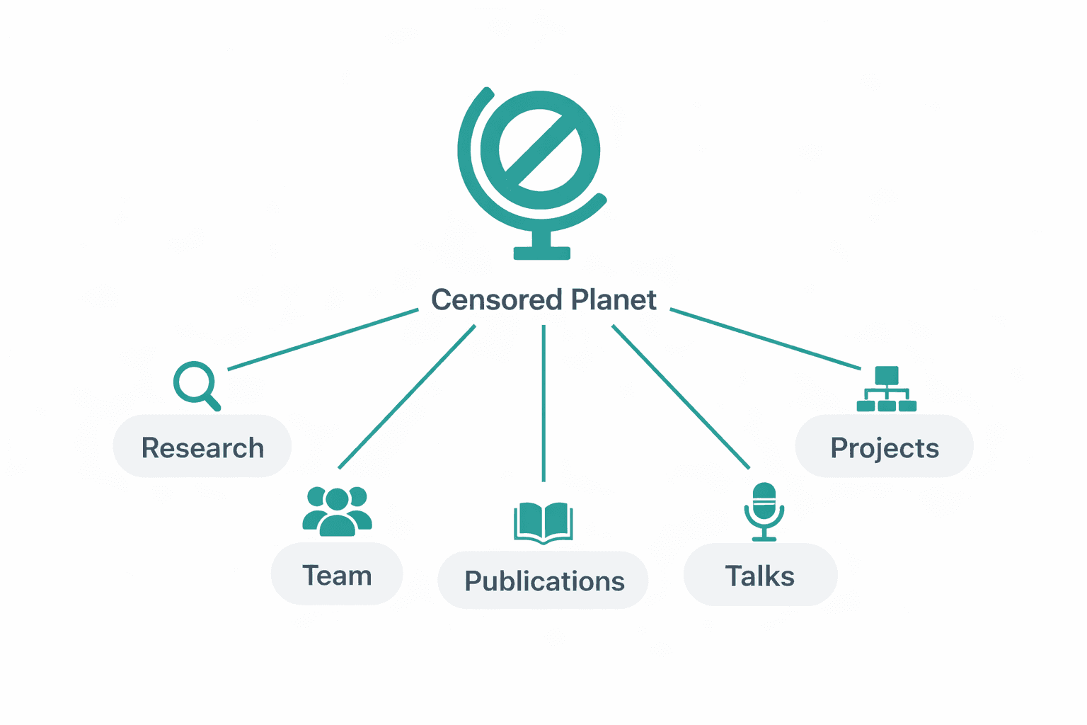 I redesigned the information architecture of the Censored Planet website, shifting it from a site centred on a single project to a platform representing the lab’s broader research ecosystem.